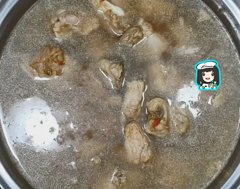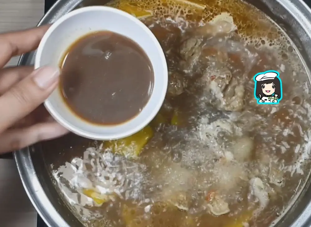 3.เติมน้ำล้างครกที่เหลือลงไป และตามด้วยน้ำเปล่า เร่งไฟให้ร้อน พอเดือดแล้วลดไฟลงเป็นไฟอ่อนปิดฝาตุ๋นจนกระดูกเปื่อย ประมาณ 20-30 นาที