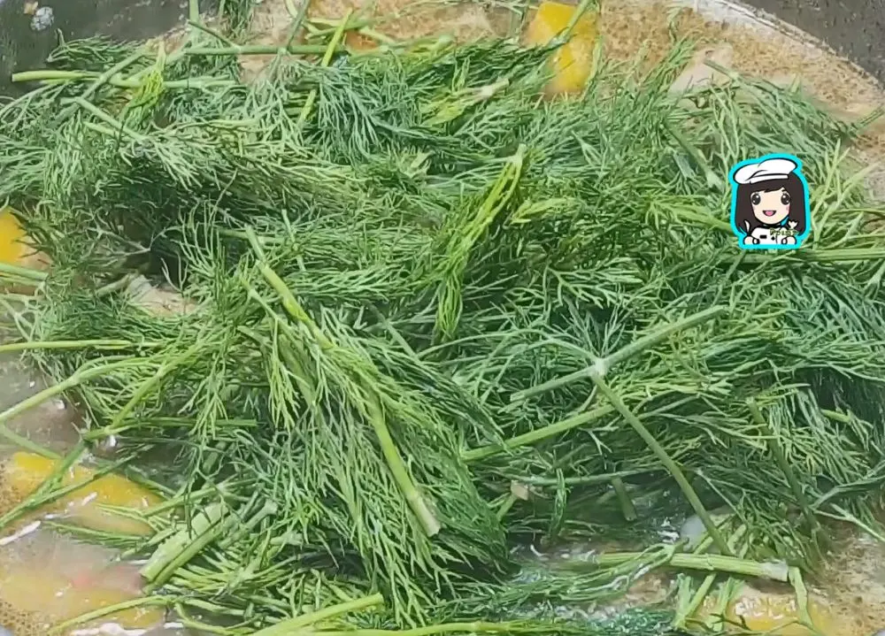 5.ได้รสตามชอบแล้วใส่ชีลาว ยอดชะอม ต้นหอมหั่นท่อน กดให้ผักจมน้ำให้เข้ากัน