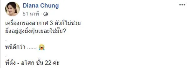 24 ม.ค. 2562 ดาราสาว "ได๋ ไดอาน่า" ได้โพสต์ภาพคราบเลือดบนกระดาษทิชชู่ พร้อมกับข้อความในทำนองว่า อยู่ตึกสูงชั้น 22 มีเครื่องกรองอากาศ 3 ตัวก็ไม่สามารถช่วยอะไรได้