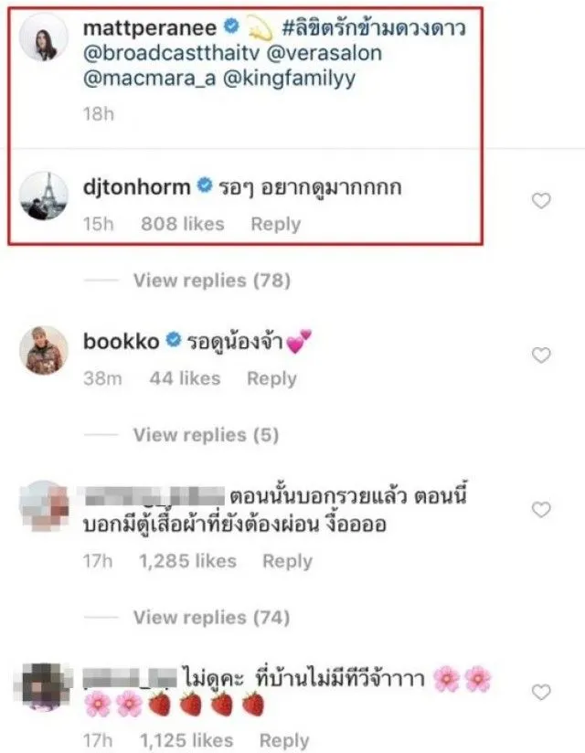ขณะที่ สาวแมท หลังเปิดใจอีกครั้งแล้ว ได้โพสต์ภาพ โปรโมทละคร ลิขิตรักฯ#ลิขิตรักข้ามดวงดาว @broadcastthaitv @verasalon @macmara_a @kingfamilyy ซึ่ง ดีเจต้นหอม ก็เข้ามาคอมเมนต์เลยว่า รอๆ อยากดูมากกกก