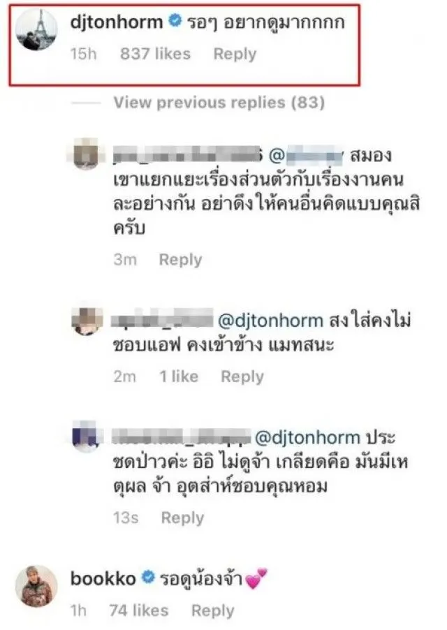 กลายเป็นดราม่าไปอีก งานเข้า ดีเจต้นหอม เลย เมื่อมีคนเข้าไปคอมเมนต์ถาม ต้นหอมเลยว่า สงสัยคงไม่ชอบแอฟ ถึงมาอยู่ทีมแมท บางคนก็ถามต้นหอมว่า ประชดป่าว ไม่ดูจ้า เกลียดคือมีเหตุผล อุตส่าห์ชอบคุณต้นหอม เช่นเดียวกับดีเจบุ๊คโกะ ก็เข้ามาคอมเมนต์ว่า รอดูน้องจ้า ก็มีคนเข้าไปคอมเมนต์ถึง บุ๊คโกะด้วยว่า ขี้เดียดค่ะ บ่เบิ่ง