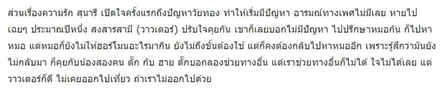 “เขาก็เลยบอกไม่มีปัญหา ไปปรึกษาหมอกัน ก็ไปหาหมอ แต่หมอก็ยังไม่ให้ฮอร์โมนอะไรมากิน ยังไม่ถึงขั้นต้องใช้ แต่ก็คงต้องกลับไปหาหมออีก เพราะรู้สึกว่ามันยังไม่กลับมา ก็คุยกับน้องสองคน ตั๊ก กับ ฮาย ตั๊กบอกลองช่วยทางอื่น แต่เราช่วยทางอื่นก็ไม่ได้ ใจไม่ได้เลย แต่วาวเตอร์ก็ดี ไม่เคยออกไปเที่ยว ถ้าเราไม่ออกไปด้วย”