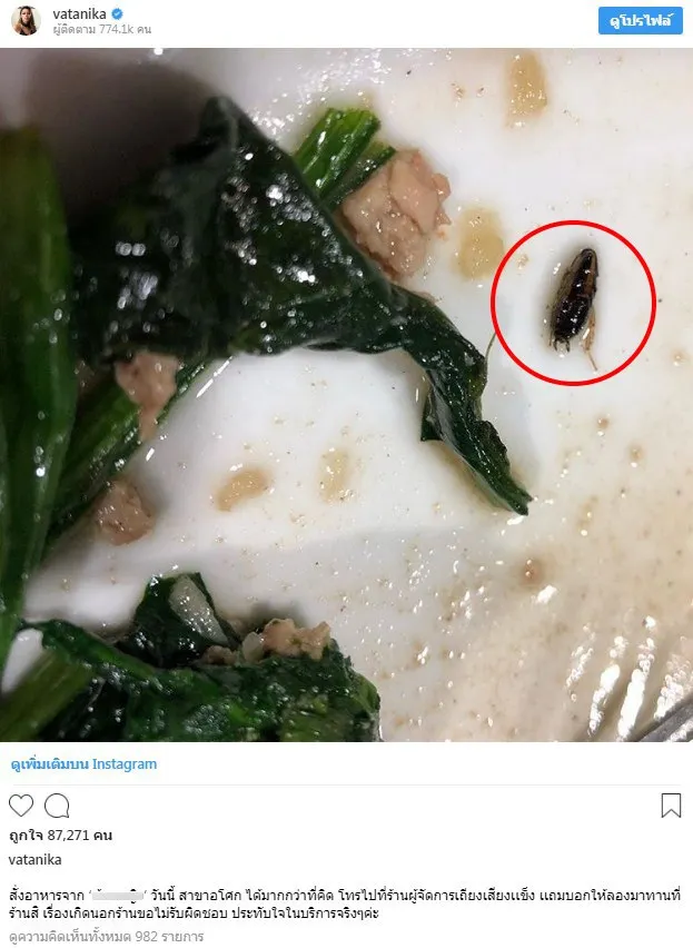 แพร วทานิกา โพสต์จวกร้านอาหารดัง เจอแมลง แถมมาในอาหาร