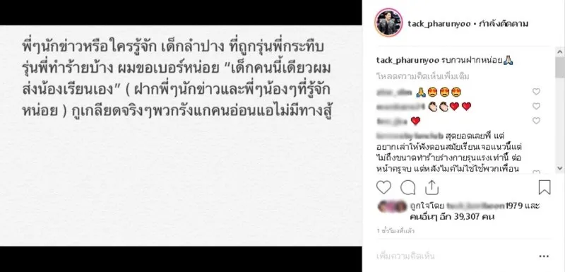 ล่าสุดเมื่อ วันที่ 30 ม.ค. 2562 ผู้สื่อข่าวรายงานว่า แทค ภรัณยู โรจนวุฒิธรรม ได้โพสต์ถึงเรื่องดังกล่าวผ่านไอจี tack_pharunyoo โดยอยากช่วยเหลือน้องที่ถูกทำร้าย ว่าเด็กคนนี้เดี๋ยวผมส่งน้องเรียนเอง เกลียดจริงๆ พวกรังแกคนอ่อนแอไม่มีทางสู้