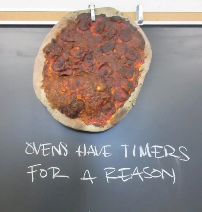 11. “คุณครูสอนวิชาทำอาหารของฉัน ติดพิซซ่าเกรียมๆ นี้ไว้บนกระดานดำ” (เธอเขียนว่า เตาอบมีเครื่องจับเวลาเพื่อเหตุผลนี้)