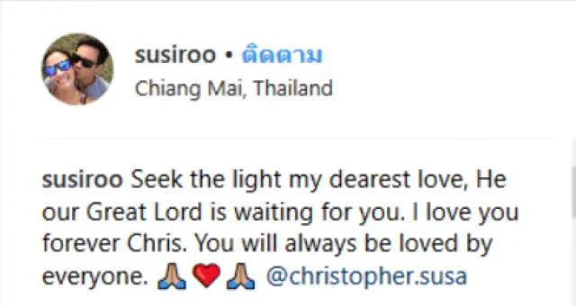 หลังจากกรที่คู่หมั่นหนุ่มของนักแสดงสาว ซูซี่ สุษิรา อย่าง คริสโตเฟอร์ ได้จากไปอย่างสงบก่อนที่ทางด้าน แอริน ยุกตะทัต เพื่อนสาวคนสนิท จะขอออกมาเปิดใจแทนสาวซูซี่ ถึงการจากไปของคู่หมั้นอย่างไม่มีวันกลับ และ ล่าสุดถือเป็นครั้งแรกที่สาวซูซี่ออกมาเคลื่อนไหวในอินสตาแกรมของสาวแอริน ที่ได้โพสต์ขอบคุณสื่อและทุกกำลังใจหลังจากที่ได้ให้สัมภาษณ์กับสื่อมวลชน โดยสาวซูซี่ ได้เข้าไปคอมเม้นท์ในโพสต์ของ สาวแอริณ ระบุว่า You spoke with such grace, compassion, love, sincerity and wisdom. I cried so much. My heart bursts thinking about how grateful I am. And how much I love you Aerin.ขอบคุณพี่ๆสื่อและทุกคนที่ให้ความรักและกำลังใจ ซี่จะสู้ต่อไป ซี่พูดไม่ออกเลย ขอบคุณจากใจจริงค่ะ อย่างไรก็ตามทางด้านทีมงานก็ขอเป็นกำลังใจให้ สาวซูซี่ด้วยค่ะ