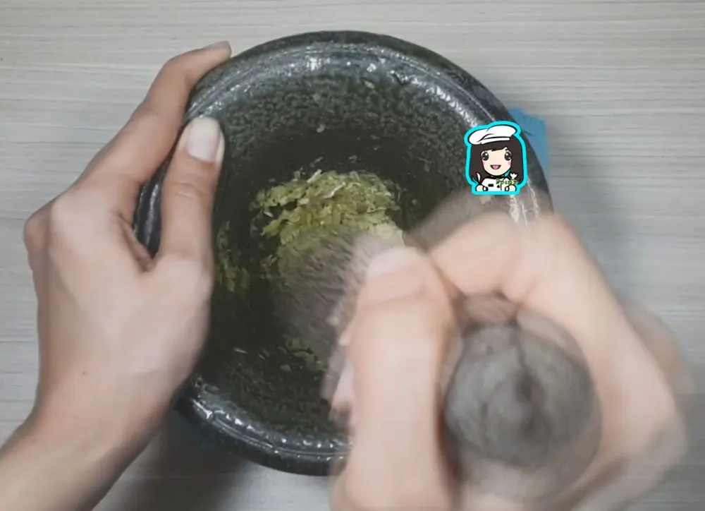 2.โขลกรากผักชี กระเทียม พริกไทย จนเกือบละเอียดเป็นสามเกลอ