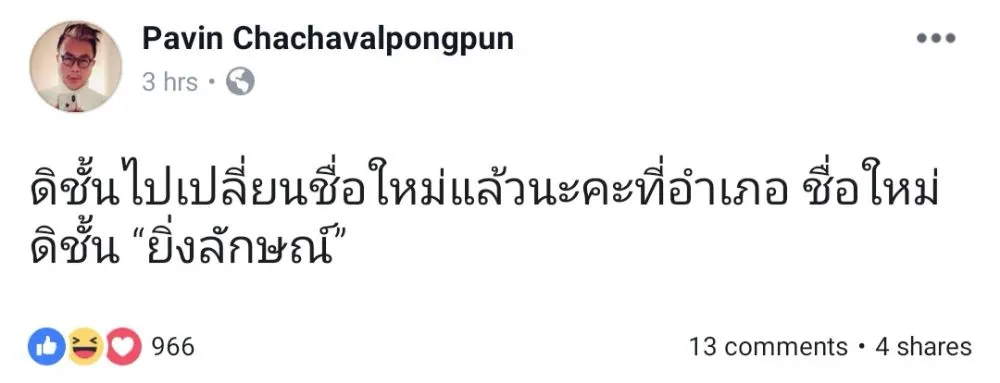 ล่าสุดด้านรศ.ดร.ปวิน ชัชวาลพงศ์พันธ์ อาจารย์มหาวิทยาลัยโตเกียว ประเทศญี่ปุ่น แสดงความคิดเห็น กรณี พรรคเพื่อไทย สส.จะเปลี่ยนชื่อ ทักษิณและยิ่งลักษณ์ ว่าดิชั้นไปเปลี่ยนชื่อใหม่แล้วนะคะที่อำเภอ ชื่อใหม่ดิชั้น “ยิ่งลักษณ์”