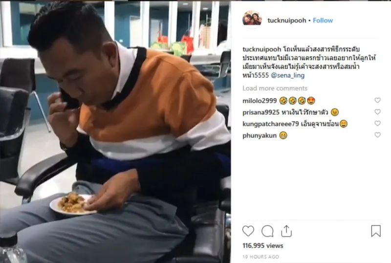 ไอจีส่วนตัวของ ตั๊ก ศิริพร ที่ใช้ชื่อว่า tucknuipooh ได้โพสต์คลิปของ เสนาลิง สมเกียรติ จันทร์พราหมณ์ พิธีกรดัง ที่กำลังกินข้าวอยู่ โดยระบุแคปชั่นบนคลิปนี้ว่า โถเห็นแล้วสงสารพิธีกรระดับประเทศแทบไม่มีเวลาแดรกข้าวเลยอยากให้ลูกให้เมียมาเห็นจังเลยไม่รู้เค้าจะสงสารหรือสมน้ำหน้า5555 @sena_ling