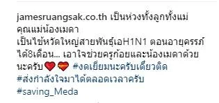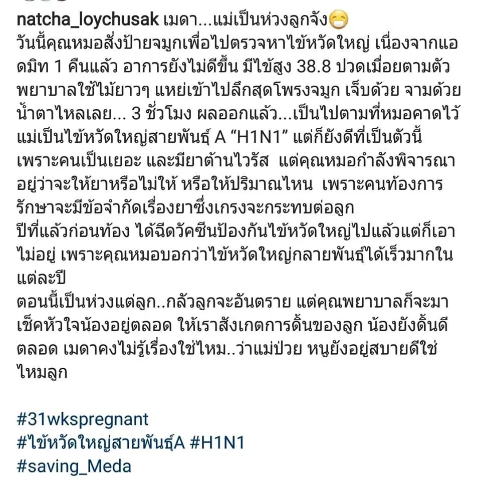 "เป็นห่วงทั้งลูกทั้งแม่ คุณแม่น้องเมดา เป็นไข้หวัดใหญ่สายพันธุ์เอH1N1 ตอนอายุครรภ์ ได้ 8 เดือน เอาใจช่วยครูก้อยและน้องเมดาด้วยนะครับ งดเยี่ยมนะครับเดี๋ยวติด ส่งกำลังใจมาได้ตลอดเวลาครับ"