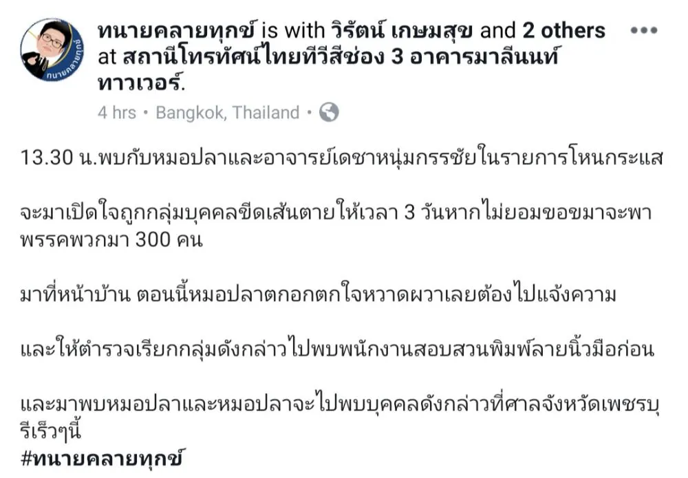 มีกลุ่ม 300 คนบอกจะเดินทางไปเรียกร้องให้หมอปลาขอขมาพ่อแก่ ขีดเส้นตายให้เวลา 3 วัน หมอปลาเลยให้ทนายโหนกระแสพาไปแจ้งความแล้ว