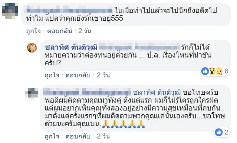 และจากการตรวจสอบไปยังเฟซบุ๊กของหนุ่มเบน เจ้าตัวก็ได้มีการโพสต์ข้อความเศร้ารัว ๆ หลังจบสัมพันธ์รัก 10 ปี ซึ่งก็มีแฟนคลับเข้ามาสอบถามว่าเหตุใดถึงเลิกรา โดยหนุ่มเบนเองก็ได้ตอบกลับทันทีว่า "รักก็ไม่ได้หมายความว่าต้องทนอยู่ด้วยกัน" และ "ถ้าสองคนยังรักกันลำบากแค่ไหนก็ทนได้ครับ"