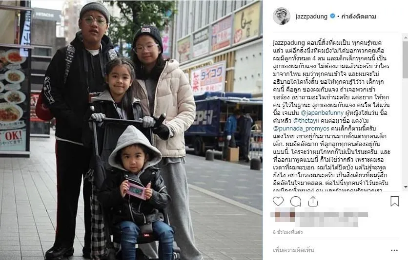 เป็นตลกตัวท็อปของประเทศไทยเลยก็ว่าได้สำหลับ แจ๊ส ชวนชื่น ซึ่งล่าสุดแจ๊สได้โพสต์ผ่านอินสตาแกรมส่วนตัว พูดถึงลูกๆ จริงๆแล้วแจ๊สไม่ได้มีแค่น้องแตกไทยคนเดียว แต่มีลูกกับแจง ถึง 4คน โดยแจ๊สระบุข้อความว่า…