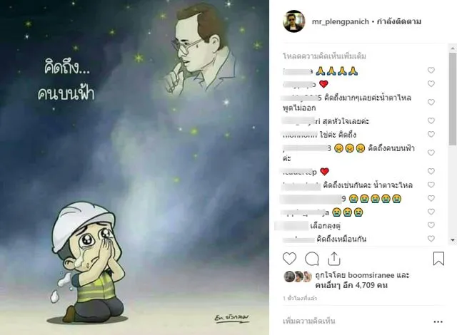 ล่าสุดดารรุ่นใหญ่อย่าง นก ฉัตรชัย ก็ได้ออมาเคลื่อนไหวถึงกรณีดังกล่าวเช่นเดียวกันโดยได้ออกมาโพสต์ภาพ เป็นตัวหนังสือการ์ตูนร้องไห้โดยไม่มีแคปชั่นอะไรเลยพร้อมกับเป็นภาพที่บอกว่า คิดถึงคนที่อยู่บนฟ้า