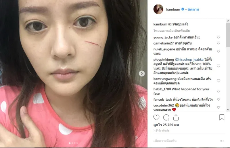 แก้มบุ๋ม เล่นเอาแฟนคลับตกใจกันแต่เช้าเลย เมื่อเจ้าตัวโพสต์ภาพที่ใบหน้าตัวเองนั้นมีรอยขีดยาวมากกว่า 3 ถึง 4 นิ้ว และใบหน้าของเธอนั้นมีรอยขีดข่วน สร้างความตกใจให้แฟนคลับไม่น้อยต่างก็เข้าไปคอมเม้นต่างกันอย่าว่าเต็มไปหมดว่ามันเกิดอะไรขึ้นเป็นอะไรถึงได้เป็นรอยขนาดนี้ทำเอาเธอนั้นเสียโฉมเลยทีเดียว ทั้งนี้หลังจากเจ้าตัวได้โพสต์ภาพดังกล่าวพร้อมแคปชั่น โดยระบุข้อความว่า...