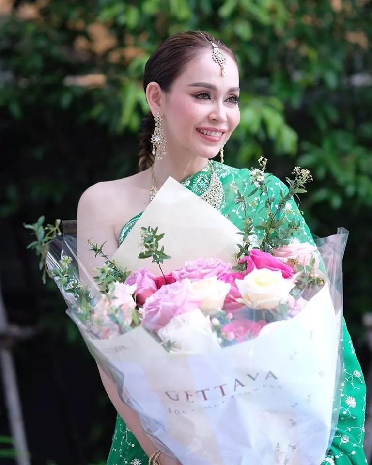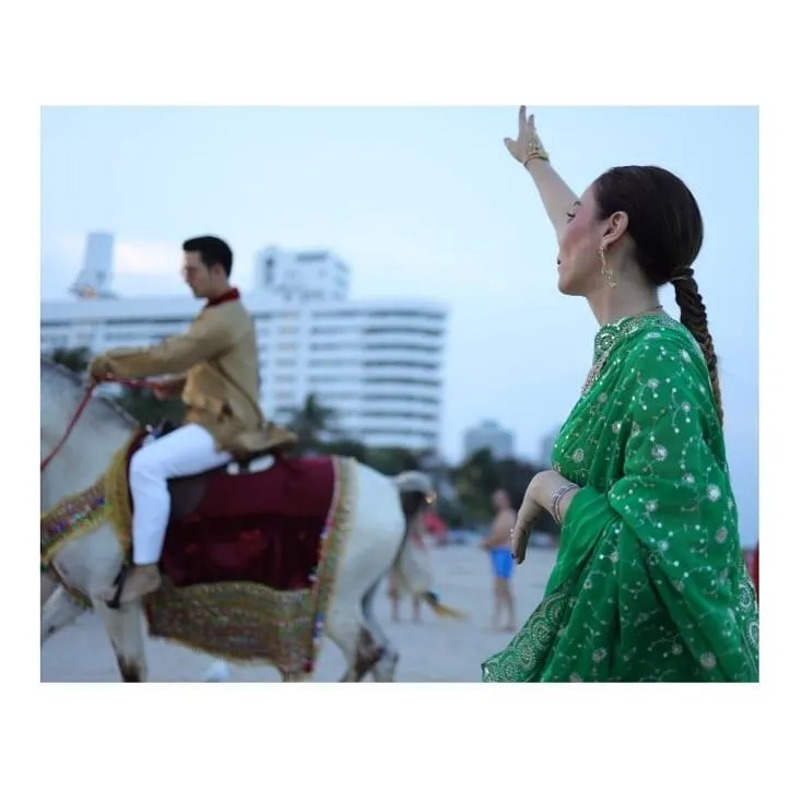 ดูสวยมากแถมใส่ความเก๋ด้วยการสวมแว่นตาดำทรงกลมดูลงตัวเป็นที่สุด ด้าน นัท มีเรีย มาในชุดสาหรีสีเขียวมรกตเป็นลุคที่แปลกตาไม่เคยเห็นมาก่อน เรียกว่าสาวๆ เห็นทั้งคู่ใส่สาหรีแล้วต่าง