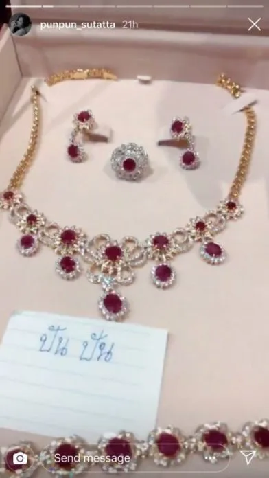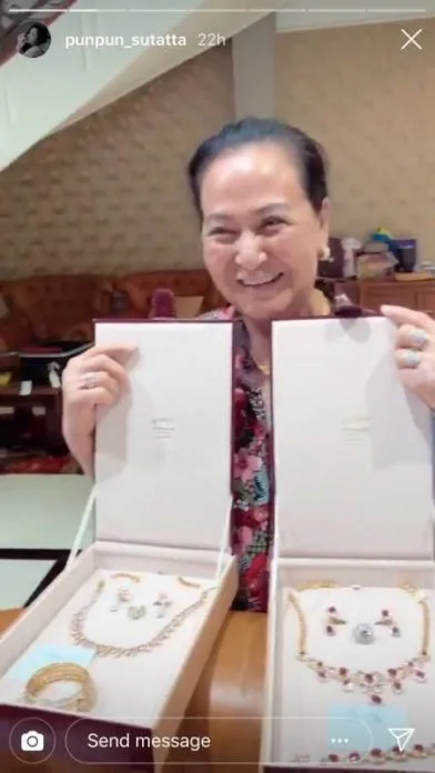 หลังสาว เซอร์ไพรส์ ปันปัน สุทัตตา อุดมศิลป์ เผยว่าได้อั่งเปาเครื่องเพชรชุดใหญ่จากย่า ล่าสุดเธอออกมาเปิดใจว่า เป็นชุดเครื่องเพชรที่เก็บไว้เมื่อ30 ปีที่แล้ว เป็นชุดใหญ่มาก ไม่กล้าใส่ ไม่ทราบว่ามีมูลค่าเท่าไร