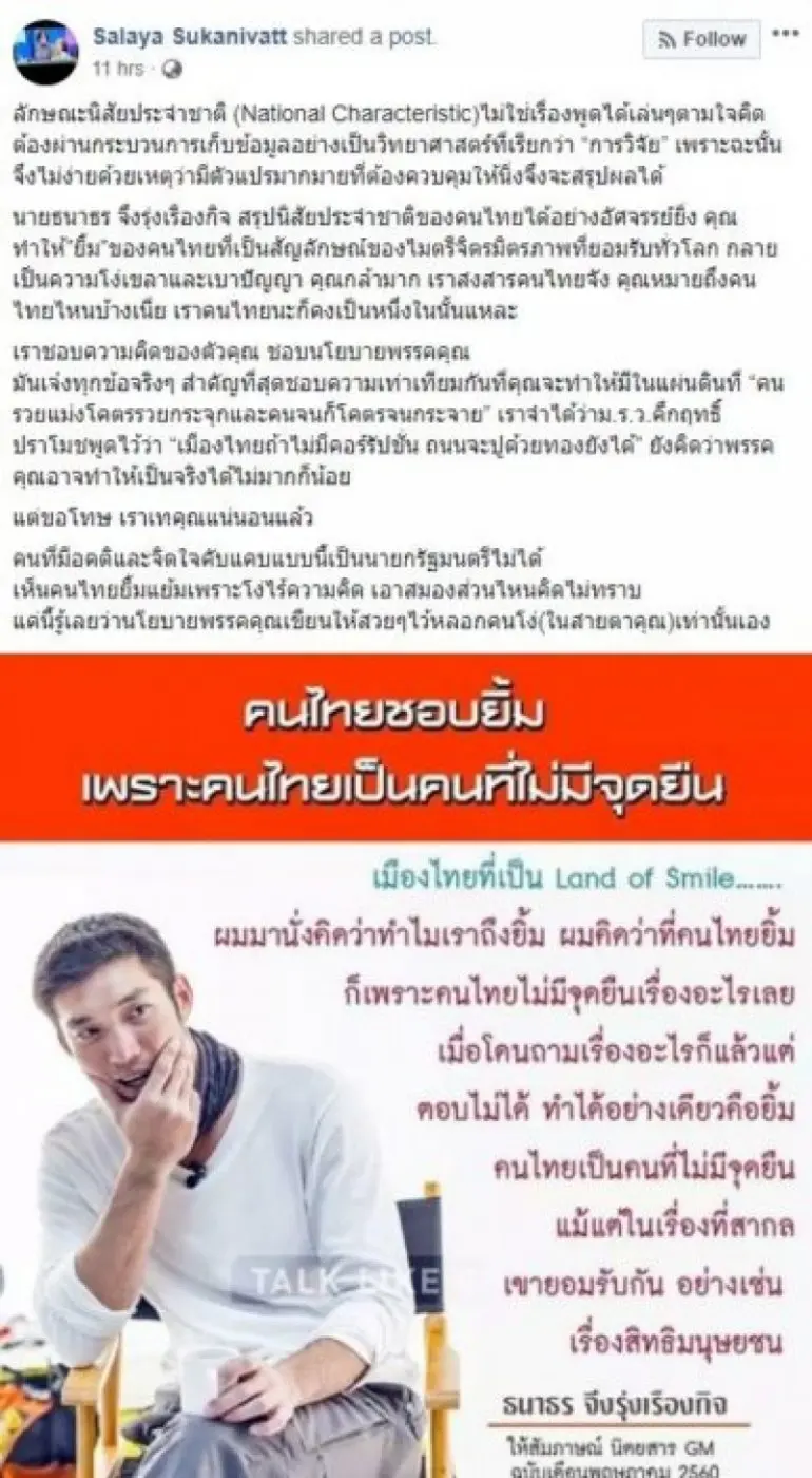 โดยเป็นการแชร์โพสต์คำสัมภาษณ์ของธนาธร ที่พูดเกี่ยวกับนิสัยการยิ้มของคนไทย ความว่า ลักษณะนิสัยประจำชาติ ไม่ใช่เรื่องพูดได้เล่นๆตามใจคิด ต้องผ่านกระบวนการเก็บข้อมูลอย่างเป็นวิทยาศาสตร์ที่เรียกว่า “การวิจัย” เพราะฉะนั้นจึงไม่ง่ายด้วยเหตุว่ามีตัวแปรมากมายที่ต้องควบคุมให้นิ่งจึงจะสรุปผลได้
