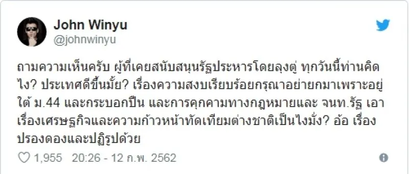 จอห์น วิญญู โพสต์ถาม คนสนับสนุนรัฐประหารโดยลุงตู่ ทุกวันนี้ ประเทศดีขึ้นไหม