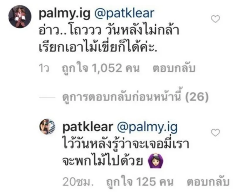 โดย สาวปาล์มมี่ เห็นภาพดังกล่าวก็ได้เข้ามาคอมเมนต์ตอบกลับ เป็นข้อความน่ารักปนฮา งานนี้แฟนคลับอย่าง แพท วงเคลียร์ น่าจะฟินเอามากๆ