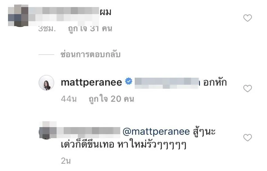 ล่าสุด มีประเด็นร้อนแรงไฟลุกให้ขาเผือกได้ชวนสงสัยอีกแล้วกับการเข้าไปตอบคอมเมนท์ของ แมท ภีรนีย์ ที่พิมพ์ด้วยประโยคที่ว่า อกหัก ตามด้วยเพื่อนได้เข้ามาพิมพ์ปลอบใจกับประโยคที่ว่า “สู้ๆ นะเดี๋ยวก็ดีขึ้นเธอ หาใหม่รัวๆ” ข้อความดังกล่าวสร้างความสงสัยเป็นอย่างมาก จนทำให้หลายคนตั้งข้อสงสัยว่าหรือ แมท กับ สงกรานต์ ความรักจะสะดุดแล้วหรือเปล่า IG: mattperanee แมท ภีรนีย์ พิมพ์ตอบคอมเมนต์เพื่อนว่า อกหัก