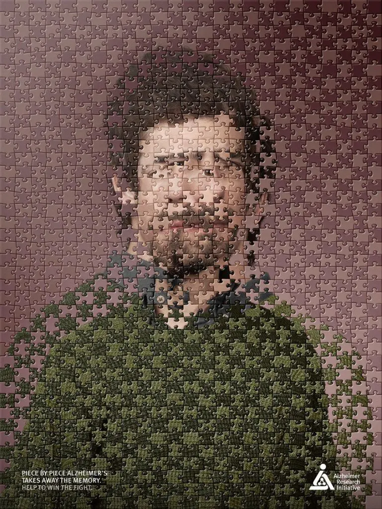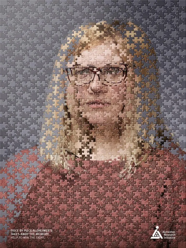Alzheimer Forschung Initiative องค์กรช่วยเหลือผู้ป่วยโรคอัลไซเมอร์ ประเทศเยอรมนี ร่วมกับ BBDO Germany จัดทำ Print Ads รณรงค์ให้สังคมเข้าใจหัวอกของผู้ป่วยโรคอัลไซเมอร์ ด้วยภาพจิ๊กซอว์ ที่สื่อให้เห็นถึงความทรงจำของผู้ป่วยที่ความทรงจำบางเรื่อง อาจไม่สามารถนำมาประติดประต่อกันได้อย่างถูกต้อง เพราะความทรงจำในบางช่วงเวลาอาจหายไป ทำให้ไม่สามารถจดจำเรื่องราวได้อย่างชัดเจน ภาพโฆษณาชิ้นนี้จึงต้องการสื่อให้สังคมเห็นอกเห็นใจผู้ป่วยโรคอัลไซเมอร์ที่ปัจจุบันมีจำนวนเพิ่มมากขึ้นเรื่อย ๆ นั่นเอง