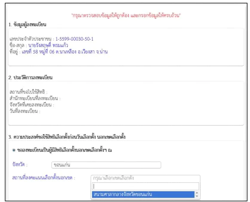 ✔︎ ตรวจสอบข้อมูลว่าชื่อ นามสกุล ว่าถูกต้องหรือไม่ ถ้าถูกต้องแล้ว ขั้นตอนต่อไปคือ เลือกสถานที่เลือกตั้งนอกเขต ให้เลือกสถานที่เราสามารถเดินทางไปเลือกตั้งสะดวกที่สุด