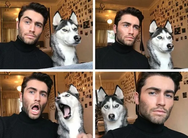 สุนัขพันธุ์ไซบีเรียนฮัสกี้และเจ้าของที่เป็นหนุ่มหล่อ ที่ดูหล่อ เท่ และมีเสน่ห์ทั้งคนและสุนัข และยังมีความป่วน กวน และฮาในระดับเดียวกัน เกิดเป็นภาพเซลฟี่ที่น่ารักครบเครื่องและขำกลิ้งสุดๆ แบบนี้