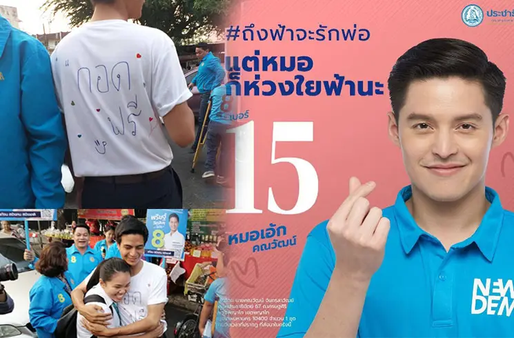 ด้าน นพ.คณวัฒน์ หรือหมอเอ้ก ผู้สมัครเขต ส.ส.กทม. บางซื่อ-ดุสิต (ยกเว้นแขวงถนนนครไชยศรี) พรรคประชาธิปัตย์ หมายเลข 15 กล่าวถึงกิจกรรมกอดฟรีว่า พวกเราร่วมกันคิดแคมเปญนี้ว่าจะทำกิจกรรมอะไร โดยกิจกรรมของตนจะเริ่มตั้งแต่เวลา 17.00 น. ซึ่งได้ทำสติ๊กเกอร์ 3 สีมีการระบุหัวข้อเกี่ยวกับปัญหาต่างๆ ที่เคยเสนอไปแล้ว อาทิ การใช้ประโยชน์จากพื้นที่ขนส่งมวลชนสาธารณะไปจัดทำตลาด นโยบายการเปลี่ยนแปลงวิธีการบริจาคอวัยวะของประเทศไทย ซึ่งผู้ที่มาร่วมกิจกรรมนี้จะนำสติ๊กเกอร์หัวข้อเรื่องที่แต่ละคนสนใจ มาติดบนตัวของตน และจะถ่ายรูปร่วมกัน ควบคู่กับการที่ตนประชาสัมพันธ์นโยบายของพรรคให้ประชาชนอย่างใกล้ชิด แบบติดดินมากๆ