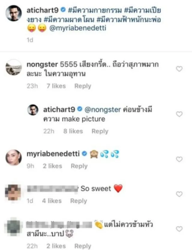 ถือเป็นอีกหนึ่งคู่รักที่มักจะมีโมเม้นต์หวานๆออกมาเรื่อยๆสำหรับสาว นัท มีเรีย และสามีสุดล่ำ อั้ม อธิชาติ ล่าสุดนี้ ทั้งคู่เจอดราม่าจนได้ เมื่อทั้งคู่ได้มีโมเมนต์หวานกันแบบไม่ต้องรอเทศกาลวาเลนไทน์ โดยล่าสุด สามีอย่าง อั้ม โพสต์คลิปเล่นน้ำกับ สาวนัท พร้อมแคปชั่นว่า #มีความกายกรรม #มีความเปียงยาง #มีความผาดโผน #มีความฟ้าหนักนะพ่อ @myriabenedetti โดยในคลิป สาวนัท ยืนเหยียบอยู่บนหลังหนุ่มอั้ม ก่อนจะกระโดดลงน้ำข้ามหัวสามีด้วยท่าสวยๆ ขณะที่หนุ่มอั้มก็ขี่หลังเล่นน้ำกันสนุกสนาน น่ารักโดยมีแฟนคลับเข้ามาบอกว่าน่ารัก ท่ายากก็มา แต่ปรากฏว่าก็มีคนเข้ามาคอมเมนต์ ว่า แต่ไม่ควรข้ามหัวสามีนะ..บาป ซึ่งสาวนัทก็เข้าไปชี้แจงเจ้าของคอมเมนต์ดังกล่าวด้วยว่า ไหว้ขอโทษก่อนขึ้นและคุณอั้มอนุญาตแล้วค่ะ