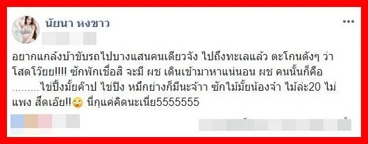 ล่าสุดอัพเดตสถานะ “อยากแกล้งบ้าขับรถไปบางแสนคนเดียวจัง ไปถึงทะเลแล้ว ตะโกนดังๆ ว่า โสดโว๊ยย!!!! ซักพักเชื่อสิ จะมี ผช เดินเข้ามาหาแน่นอน ผช คนนั้นก็คือ ………ไข่ปิ้งมั้ยค๊าป ไข่ปิง หมึกย่างก็มีนะจ้าา ซักไม้มั้ยน้องจ๋า ไม้ล่ะ20 ไม่แพง สึดเอ๊ย!! นี่กุแค่คิดนะเนี่ย5555555” โสดหนักขนาดนี้ หนุ่มๆต่อคิวเพียบ!