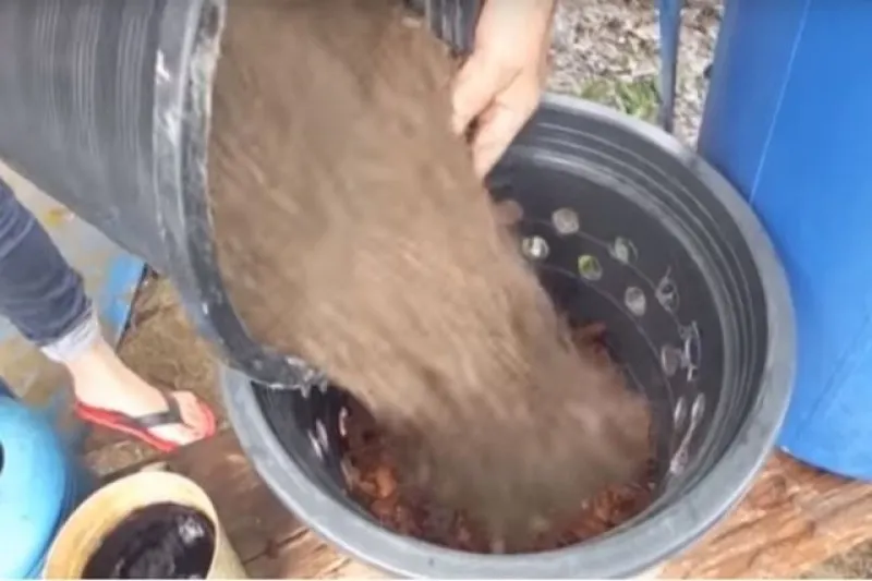 3. นำดินผสมปุ๋ยคอกมาใส่ลงบนขุยมะพร้าว