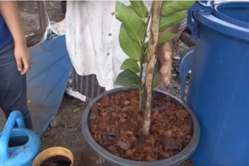 5. แล้วจากนั้นนำขุยมะพร้าวสับมาใส่ด้านบนอีกที (เอาไม้ค้ำมาเสียบไว้ข้างๆต้นมะนาวด้วยเพื่อช่วยพยุงลำต้นไว้)