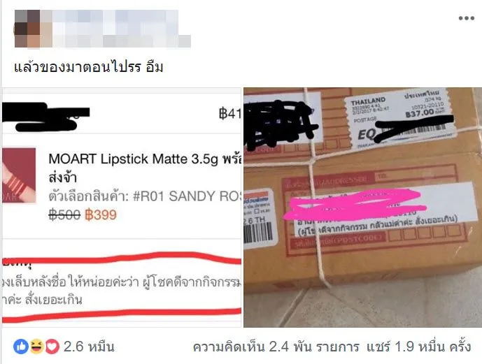 โดยผู้ใช้เฟชบุ๊กดังรายหนึ่ง ได้โพสต์รูปก่อนสั่งของและของมาส่ง พร้อมข้อความระบุไว้ว่า “แล้วของมาตอนไปรร อืม”