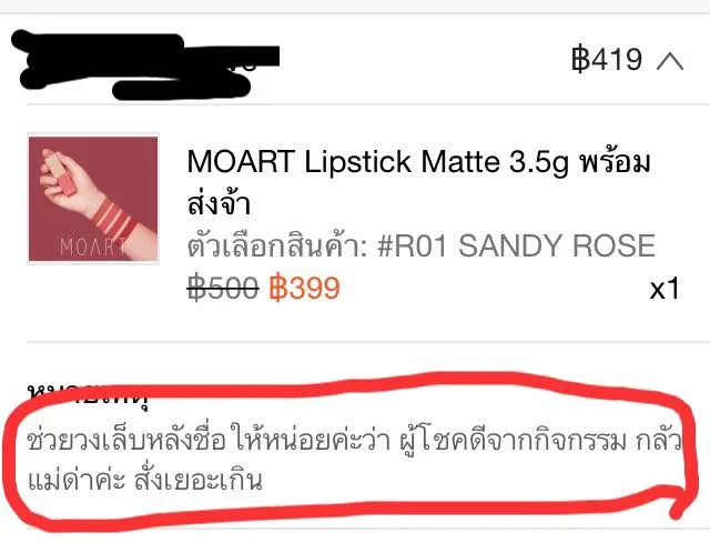 ซึ่งภาพก่อนหน้านี้ คือภาพสั่งของโดยเจ้าตัวสั่งลิปสติกยี่ห้อหนึ่งให้มาส่งที่บ้าน โดยได้ใส่หมายเหตุไว้ว่า “ช่วยวงเล็บหลังชื่อให้หน่อยค่ะว่า ผู้โชคดีจากกิจกรรม กลัวแม่ด่า สั่งเยอะเกิน” ด้วยความคิดที่แม่ค้าจะเข้าใจ จึงได้เขียนหมายเหตุไปเช่นนั้น