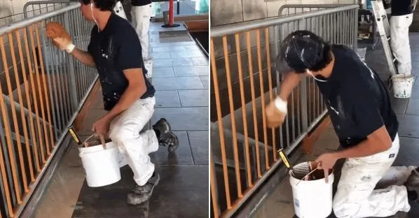 6 ชายคนนี้มีวิธีการที่ทาสีได้อย่างรวดเร็วนั่นก็คือจุ่มสีใส่ถุงมือและรูดมันลงมาเลย