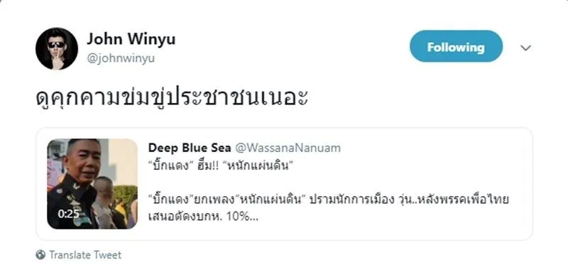 ล่าสุด จอห์น วิญญู วงศ์สุรวัฒน์ พิธีกร และดีเจชื่อดัง ได้ทวิตเตอร์ตอบโต้คำพูดของ บิ๊กแดง โดยทวิตข้อความว่า