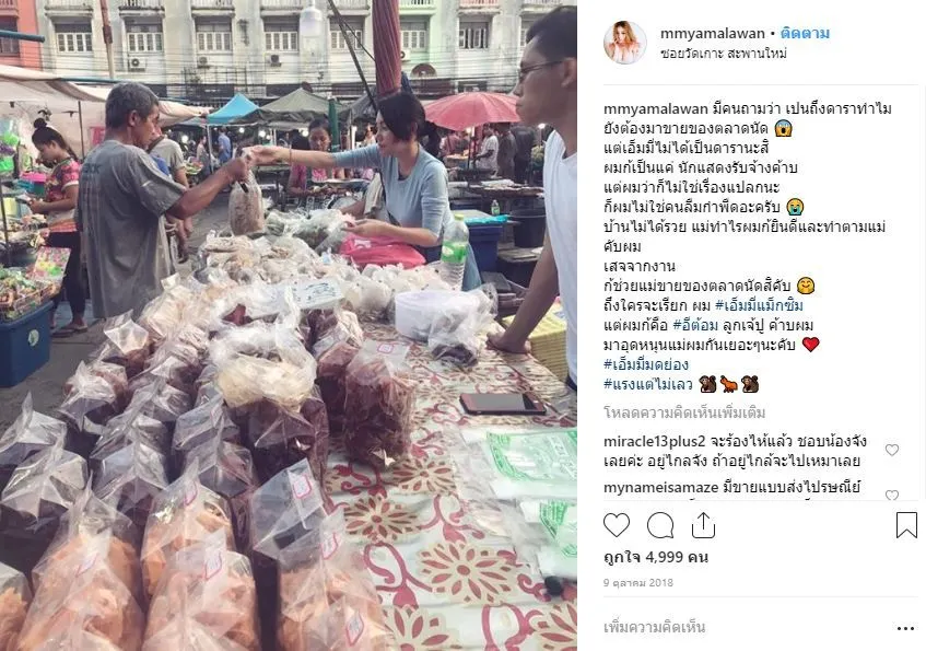 “มีคนถามว่า เปนถึงดาราทำไมยังต้องมาขายของตลาดนัด แต่เอ็มมี่ไม่ได้เป็นดารานะสิ ผมก้เป็นแค่ นักแสดงรับจ้างค้าบ แต่ผมว่าก็ไม่ใช่เรื่องแปลกนะ ก็ผมไม่ใช่คนลืมกำพืดอะครับ บ้านไม่ได้รวย แม่ทำไรผมก้ยินดีและทำตามแม่คับผม เสจจากงาน ก้ช่วยแม่ขายของตลาดนัดสิคับ ถึงใครจะเรียก ผม #เอ็มมี่แม็กซิม แต่ผมก้คือ #อีต้อม ลูกเจ้ปู ค้าบผมมาอุดหนุนแม่ผมกันเยอะๆนะคับ #เอ็มมี่มดย่อง #แรงแต่ไม่เลว”