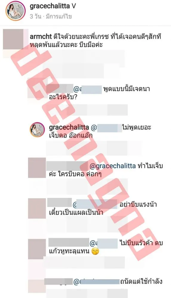 เจอโยงทันทีหรือจะเกี่ยวกับกรณีที่ก่อนหน้านี้อดีตแฟนเก่า เกรซ ชลิตา ออกมาคอมเมนต์แซ่บๆ กับเพื่อนในโซเชียลหลังเปิดตัวแฟนใหม่รึเปล่า … โดยรุ่นน้องคนสนิทของเกรซโพสต์แสดงความยินดีที่ได้หนุ่มใหม่ดูแล พร้อมบอกว่าดีใจด้วยที่”หลุดพ้นสักที” ในขณะที่สาวเกรซก็ตอบกลับทันใดว่า “ไม่พูดเยอะเจ็บคอ อ๊อกแอ๊ก”