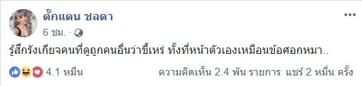 ล่าสุดไม่รู้ว่าเกิดอะไรขึ้นทางด้าน "สาวตั๊กแตน" จึงได้ออกมาโพสต์ข้อความแซบผ่านทางเฟสบุ๊กส่วนตัว โดยเจ้าตัวได้ระบุข้อความเอาไว้ว่า "รู้สึกรังเกียจคนที่ดูถูกคนอื่นว่าขี้เหร่ ทั้งที่หน้าตัวเองเหมือนข้อศอกหมา.." หูยเรียกได้ว่าแซบของจริงเลยจ้า ไม่รู้ว่างานนี้เกิดอะไรขึ้นแต่ถ้ามีอะไรคืบหน้าทางเราจะรีบนำมาอัพเดทให้ทราบกันไวๆจ้า