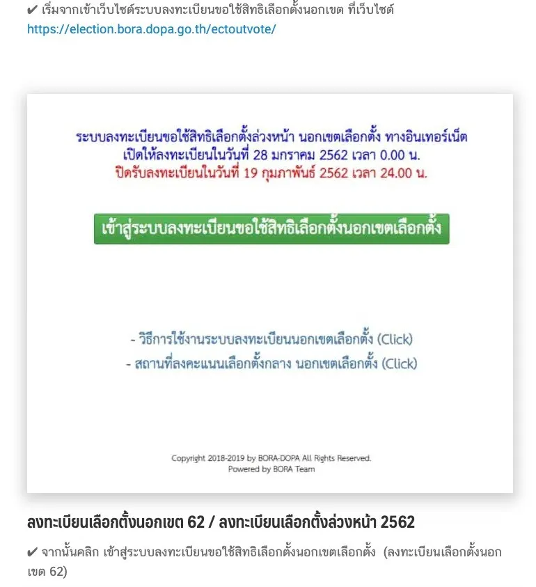 ปรากฎว่า วันเลือกตั้งจริง 24 มี.ค. 2562 และเรากำหนดให้วันที่ 17 มี.ค. 2562 เป็นวันเลือกตั้งล่วงหน้าในเขตและนอกเขต คือ คนที่ติดธุระ ไม่สามารถไปใช้สิทธิได้ ก็มาใช้สิทธิวันที่ 17 มี.ค. ได้ แต่ต้องลงทะเบียนก่อน วิธีการลงทะเบียน คือ ไปลงทะเบียนที่สำนักงานทะเบียนอำเภอ หรือ ในกรุงเทพฯ ที่สำนักงานเขต หรือ ลงทะเบียนทางอินเทอร์เนตก็ได้
