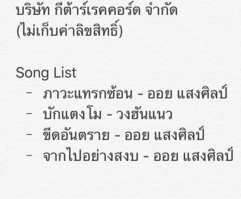 ไม่ว่าจะเป็น “ภาวะแทรกซ้อน”,ขีดอันตราย”,”จากไปอย่างสงบ”ของ “ออย แสงศิลป์”และ “บักแตงโม”วงฮันแนว วงดนตรี-รถแห่นำไปเล่นสดๆได้เลย ทำเอาคอเพลงทั่วประเทศเฮ!ดังๆ นับถือน้ำใจ “กีตาร์เรคคอร์ด” ที่มีให้เกินร้อยจริงๆCr.เธค คอนสาร