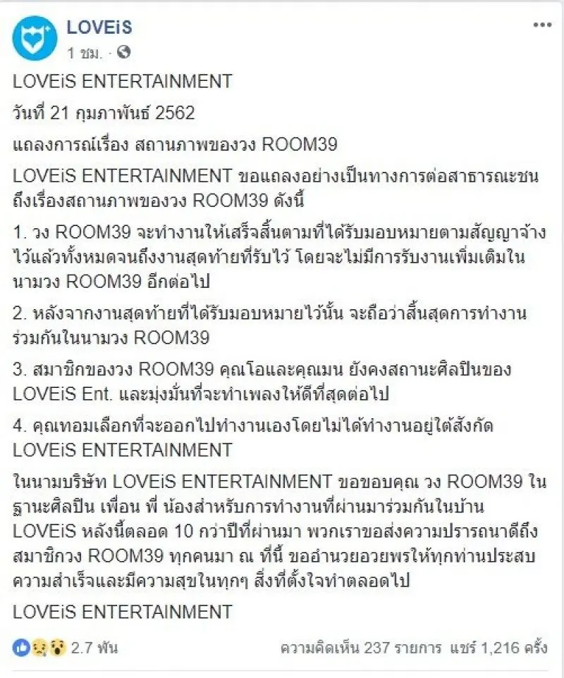 ด่วน! ปิดฉาก วงดัง ROOM39 ต้นสังกัดออกแถลงการณ์ สถานภาพวง