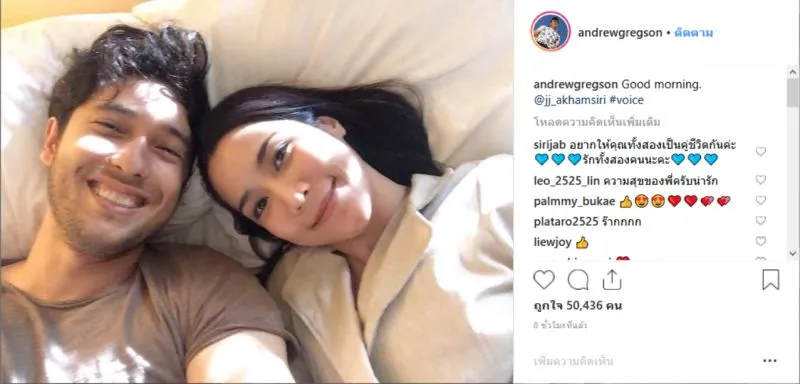 ล่าสุดทำเอาฮือฮาอีกรอบ หลัง แอนดริว ได้โพสต์ภาพคู่ดาราสาวอย่าง จั๊กจั่น บนเตียงนอน โดยใช้อินสตาแกรมส่วนตัวชื่อ andrewgregson ระบุข้อความว่า Good morning. @jj_akhamsiri #voice