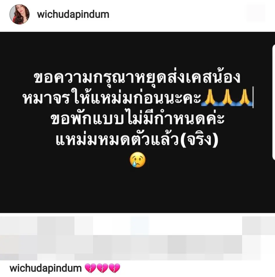 “ขอความกรุณาหยุดส่งเคสน้องหมาจรใหม่แหม่มก่อนะคะ ขอพักแบบไม่มีกำหนดค่ะ แหม่มหมดตัวแล้ว(จริง)” พร้อมกับเขียนอธิบายต่อว่า “ตลอด 4 ปีกว่าที่ผ่านมา แหม่มทุ่มเททำสิ่งนี้มาอย่างเต็มความสามารถ แหม่มหมดตัวแล้วจริงๆค่ะ หยุดส่งมาขอความช่วยเหลือแหม่มก่อนนะคะ ได้โปรดจริงๆ แหม่มหาเงินคนเดียว แหม่มหาเงินไม่ทันแล้ว ทุกตัวที่ช่วยเหลือ แหม่มมีแต่ใบเสร็จค่าใช้จ่ายรักษาน้องๆ เอาไปลดหย่อนอะไรไม่ได้เลยแม้แต่บาทเดียว งานแหม่มก็ไม่ได้เยอะ เอาเงินเก็บมาใช้รักษาน้องๆ จนหมดแล้ว ร้อยกว่าตัว