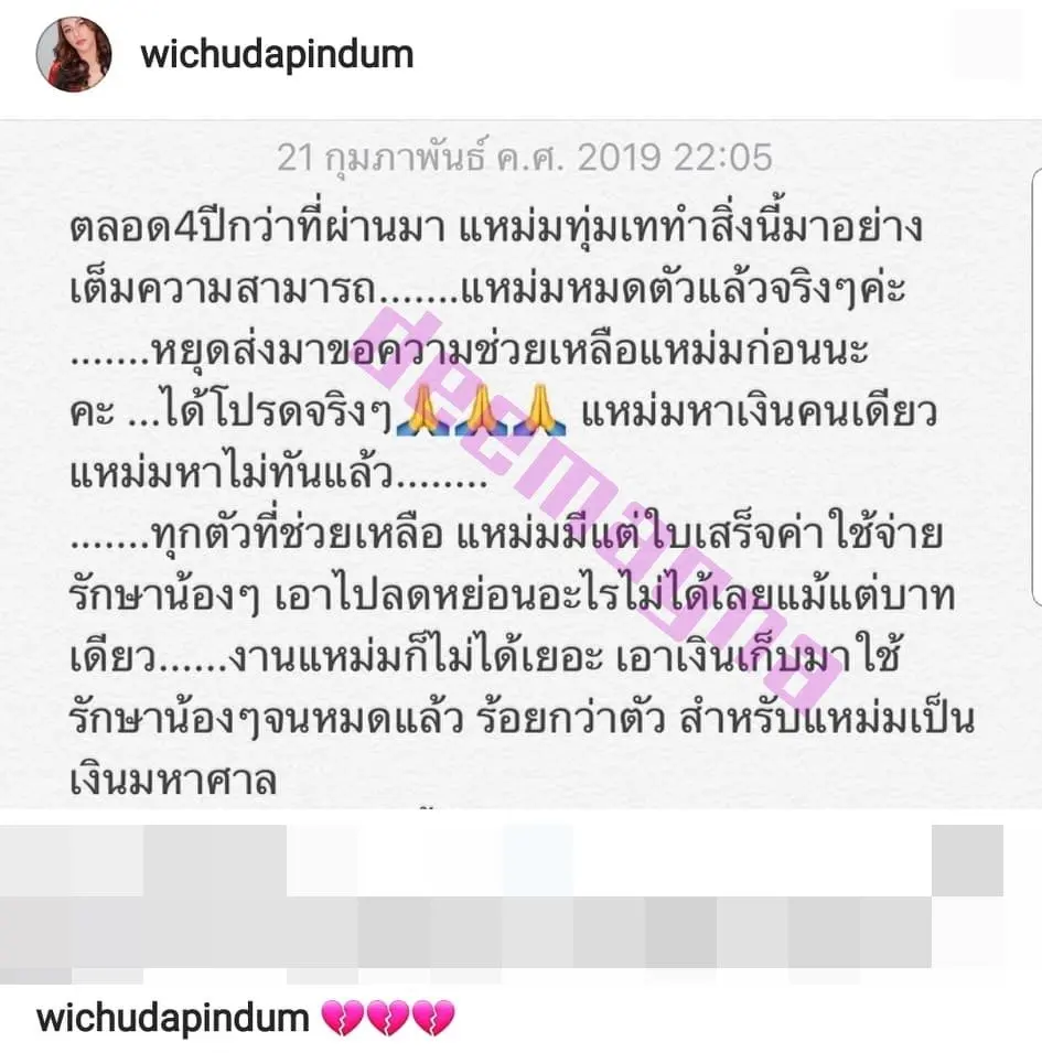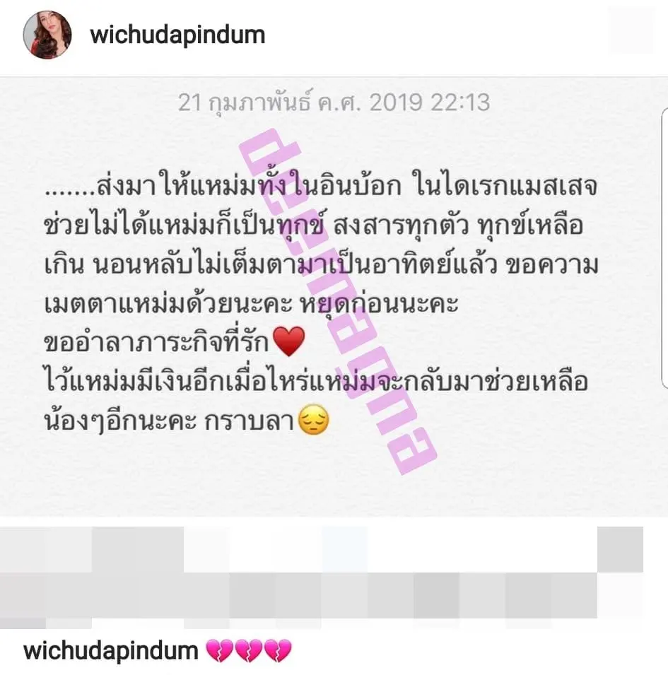 สำหรับแหม่มเป็นเงินมหาศาล ส่งมาให้แหม่มทั้งอินบอกซ์ ในไดเรกแมสเสจ ช่วยไม่ได้แหม่มก็เป็นทุกข์ สงสารทุกตัว ทุกข์เหลือเกิน นอนหลับไม่เต็มตามาเป็นอาทิตย์แล้ว ขอความเมตตาแหม่มด้วยนะน หยุดก่อนะคะ ขออำลาภาระกิจที่รัก ไว้แหม่มมีเงินอีกเมื่อไหร่แหม่มจะกลับมาช่วยเหลือน้องๆ อีกนะคะ กราบลา”