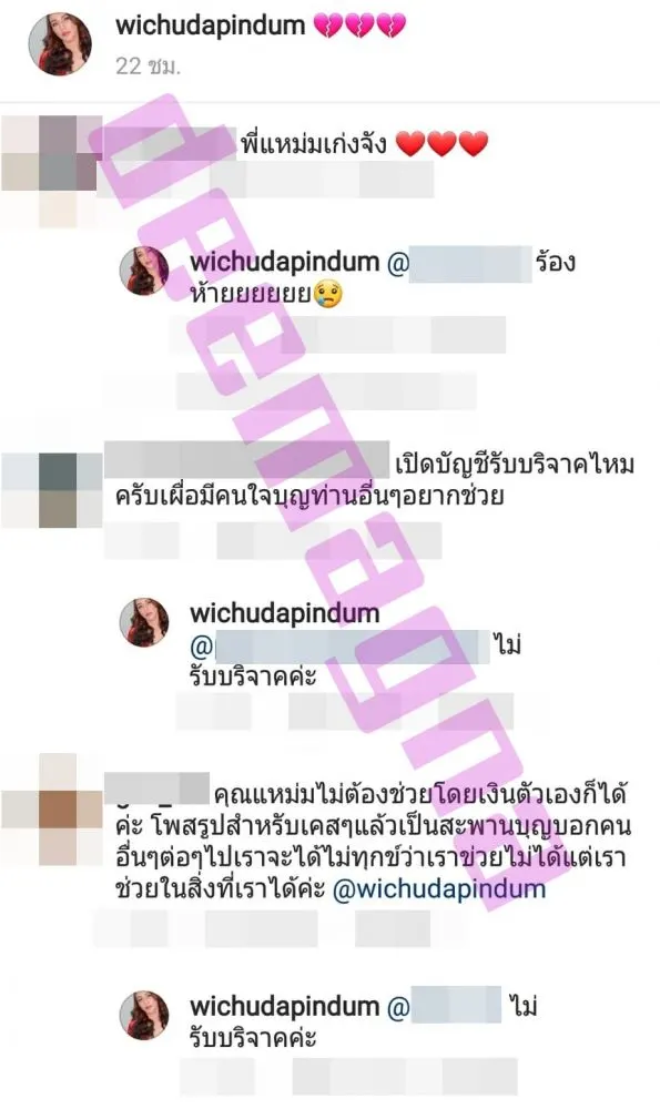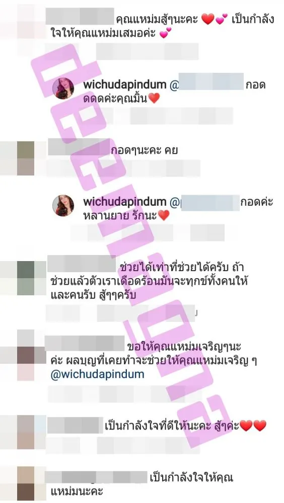 มีแฟนๆ เข้ามาเมนต์ให้กำลังใจกันอย่างหนาแน่น อาทิ นางฟ้าของน้องหมา ,ทำได้เท่าทีทำค๊ะคุณแหม่ม คุณทำมามากพอแล้ว มันไม่ใช้หน้าทีของใครคนใดคนหนึ่ง ขอให้สุขภาพแข็งแรงนะคะ ,ขอให้พระคุ้มครองพี่แหม่มครับ สู้ๆครับ งานเยอะๆเงินๆครับ ,ขอบคุณแทนน้องๆนะคะ เป็นกำลังใจให้พี่แหม่มค่ะ, สู้ๆคะอย่าคิดมากนะคนสวยใจบุญ