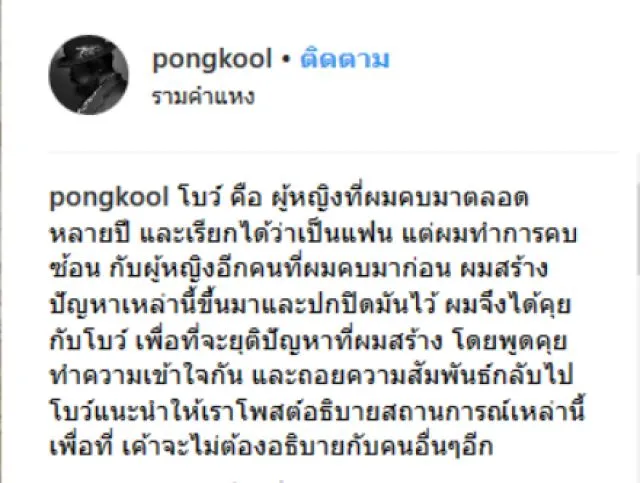 เรียกได้ว่าเป็นอีกหนึ่งเรื่องราวที่ทำเอาโซเชียลฮือฮามากสำหรับนักร้องหนุ่มเสียงเพราะ ป๊อป ปองกูล หลังจากที่ หนุ่มป๊อป ได้ประกาศเข้าพิธีวิวาห์กับแฟนสาวนอกวงการ อาจารย์ ปลา โลกโซเชียลก็ได้เผยภาพลักษณะเหมือน หนุ่มป๊อป คบซ้อนกับสาวอีกคนนั่นก็คือ สาวโบว์ ทางด้าน หนุ่มป๊อป ได้ออกมาโพสต์ชี้แจงแล้วว่า ตนนั้นคบซ้อนจริง และล่าสุดนี้ สาวโบว์ แฟนสาวอีกคนของ หนุ่มป๊อป ได้ออกมาโพสต์ชี้แจงลงเฟสบุ๊คส่วนตัวระบุข้อความว่า โบว์นอนไม่ได้เลย โบว์เห็นทุกเพจ ทุกคอมเม้น โบว์เห็นเพื่อน เห็นญาติๆมาคอยตอบคำถามแทน และโบว์ไม่สบายใจหลายอย่าง โบว์จะขอพูดเรื่องที่มีคนตำหนิโบว์นะคะ ยาวหน่อยนะ1.โบว์ไม่ใช่คนที่มีความคิดพอใจกับความสัมพันธ์3 คน และขอแจ้งว่าโบว์ไม่เคยรับรู้การมีตัวตนของอีกฝ่ายมาก่อนและรู้ทุกอย่างจากข่าวพร้อมกับทุกคนจริงๆ โบว์ไม่ได้รู้แล้วทนคบแบบที่ทุกคนคิด ถ้าโบว์รู้โบว์จะไม่มีทางปล่อยให้ความสัมพันธ์ของเรามันเกิดขึ้นแน่ๆ เพราะนี่ก็คือรักครั้งแรกของโบว์เหมือนกัน2.วันที่ขโมยขึ้น พี่ป๊อบก็โทรหาโบว์ทันที แต่ภาพข่าวที่ออกมาโบว์ไม่เคยทราบหรือเอะใจเลยว่าผู้หญิงในภาพคือใคร เพราะโบว์ไม่เคยเห็นเค้า 3.โบว์เคยไปที่บ้านพี่ป๊อบค่อนข้างบ่อย แต่เค้าไม่ได้อาศัยอยู่ด้วยกันโบว์เลยไม่เคยรู้ เราคุยกันตลอด เราเจอกันเกือบทุกวัน ไปออกกำลังกาย กินข้าว ดูหนัง เดินเล่นด้วยกัน มันไม่มีสัญญาณใดๆเลย4.เฟสบุ๊คอีกอันโบว์ก็พึ่งเห็นหลังจากเกิดเรื่อง เพราะอันที่เราใช้คุยเปิดเผยกันมันคือเฟสบุ๊คที่เป็นชื่อนามสกุลจริงของเค้า โบว์ไม่รู้เลยว่ามันจะมีอันอื่นอีกหลังจากเกิดเรื่องเราได้เจอกันและพี่เค้ายอมรับถึงได้รู้ว่าเค้าคุยกับอีกคนอยู่ตลอดโดยที่อีกฝ่ายนั้นก็รับรู้ มันบีบหัวใจโบว์มากจริงๆ ตลอดสิบปีเราผูกพันกันมาก ทุกคนที่บ้านของโบว์ก็ผูกพันกับพี่ป๊อบ โบว์เองก็คิดมาตลอดว่าเราจะได้สร้างครอบครัวด้วยกัน สิ่งที่เกิดขึ้นมันเป็นเรื่องที่ไม่มีใครคาดคิดว่าจะเกิด พี่เค้าเข้ามาขอโทษโบว์ด้วยตัวเองแล้ว และพี่ป๊อบเองก็เสียใจมากจริงๆ อย่าเรียกว่าโบว์เป็นคนหลุดพ้นเพราะทุกสิ่งที่ผ่านมาด้วยกันมันมีค่ามันคือความสุขของเราทั้งคู่สำหรับโบว์มันไม่ใช่การพ้นจากทุกข์เลย โบว์ขอบคุณทุกกำลังใจ มันเจ็บมันทรมาน มันหนักมากเหลือเกินแต่โบว์จะพยายามผ่านไปให้ได้ โบว์ยังรักและเป็นห่วงพี่ป๊อบเสมอแม้จำเป็นจะต้องลดฐานะลงมา แต่เราจะเป็นเพื่อนเป็นพี่น้องที่ดีต่อกัน โบว์เชื่อว่าเดี๋ยวคนก็ลืม เดี๋ยวข่าวก็จางหายไป แต่โบว