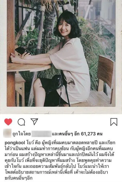 โบว์ คือ ผู้หญิงที่ผมคบมาตลอดหลายปี และเรียกได้ว่าเป็นแฟน แต่ผมทำการคบซ้อน กับผู้หญิงอีกคนที่ผมคบมาก่อน ผมสร้างปัญหาเหล่านี้ขึ้นมาและปกปิดมันไว้ ผมจึงได้คุยกับโบว์ เพื่อที่จะยุติปัญหาที่ผมสร้าง โดยพูดคุยทำความเข้าใจกัน และถอยความสัมพันธ์กลับไป โบว์แนะนำให้เราโพสต์อธิบายสถานการณ์เหล่านี้เพื่อที่ เค้าจะไม่ต้องอธิบายกับคนอื่นๆอีก