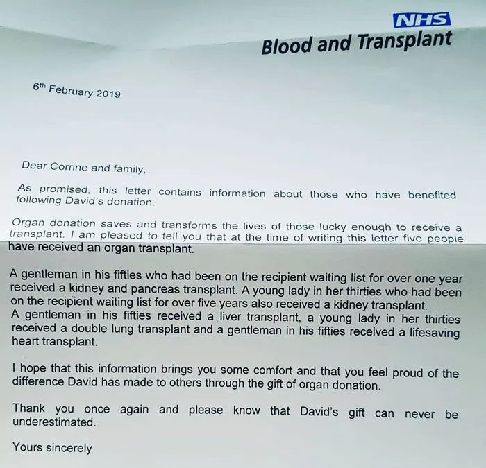 จนกระทั่งทาง NHS ได้ส่งจดหมายเพื่อขอบคุณ David และครอบครัว มีใจความว่า...